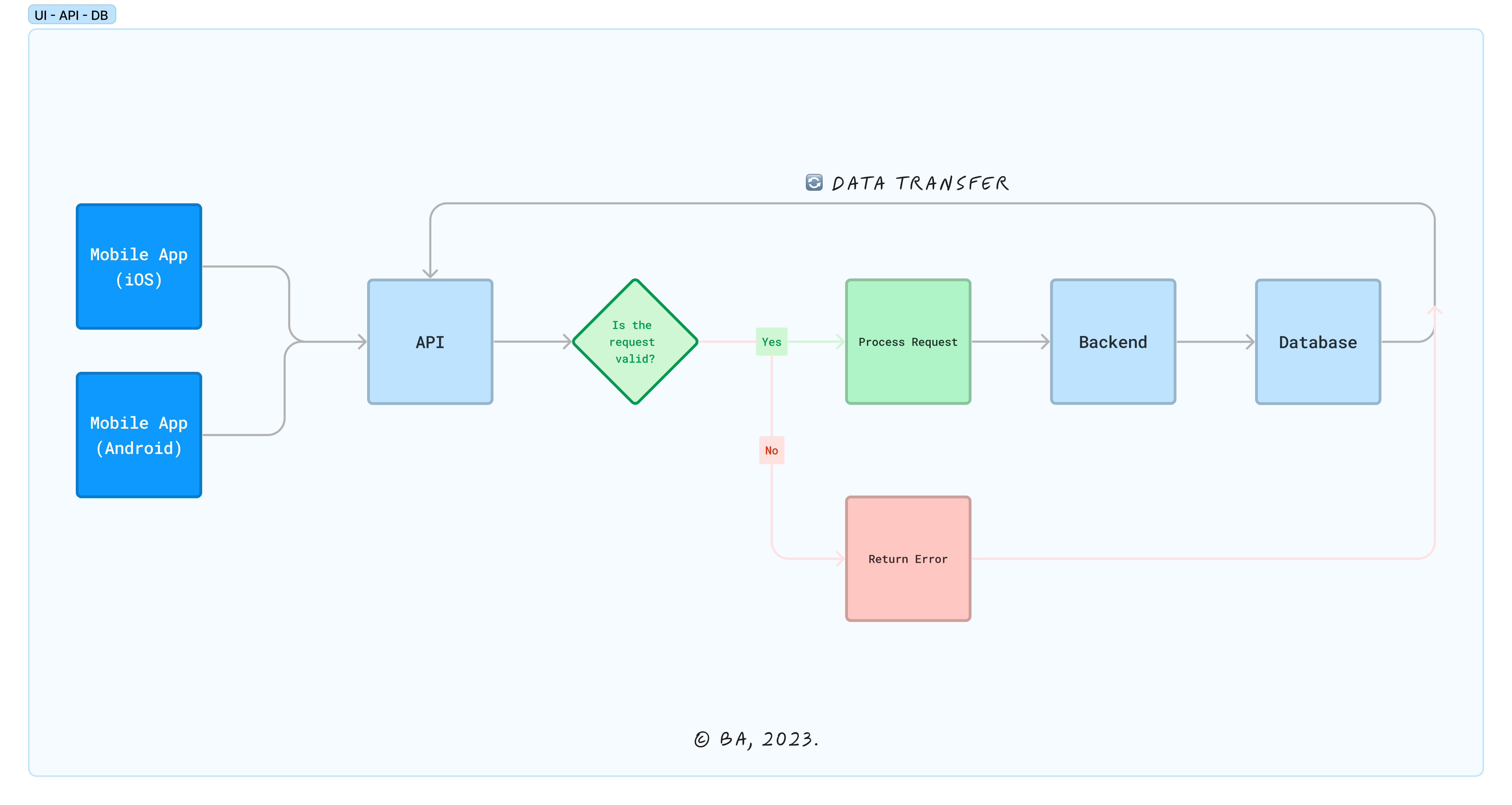 To explain server-driven UIs, let’s first talk about what the architecture looks like without server-driven UIs. A typical application over the HTTP protocol follows a client-server architecture, where data is exchanged between the frontend (client) and the backend (server) via an application programming interface (API). Based on the query requests, the backend retrieves and inserts data into the database and returns the results to the frontend. The frontend then receives the data from the backend in a structured schema and determines where and how to render it to the user interface, based on the UX goals for each UI view (feature). This is how most classic applications function, and it is the common practice today.