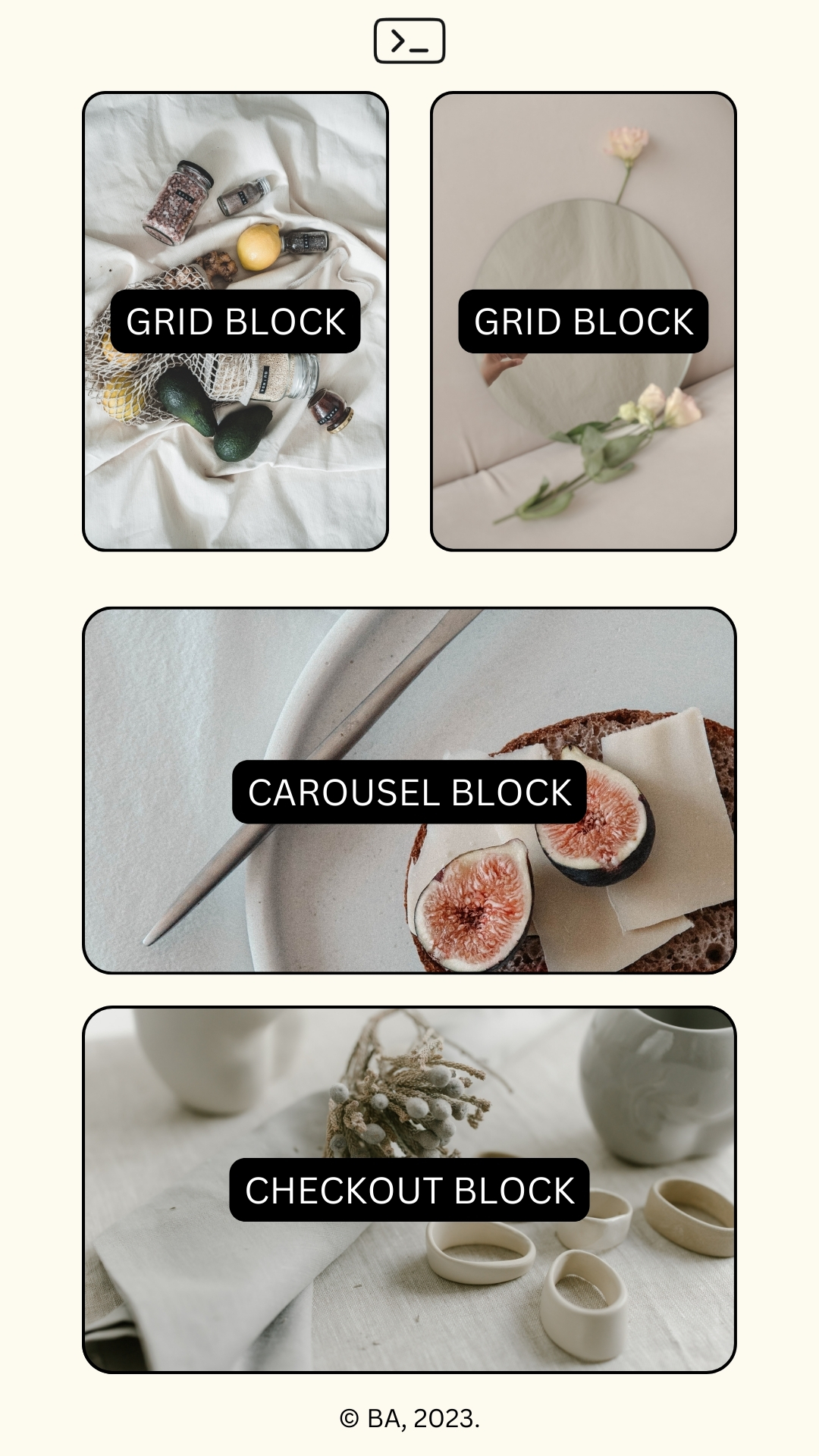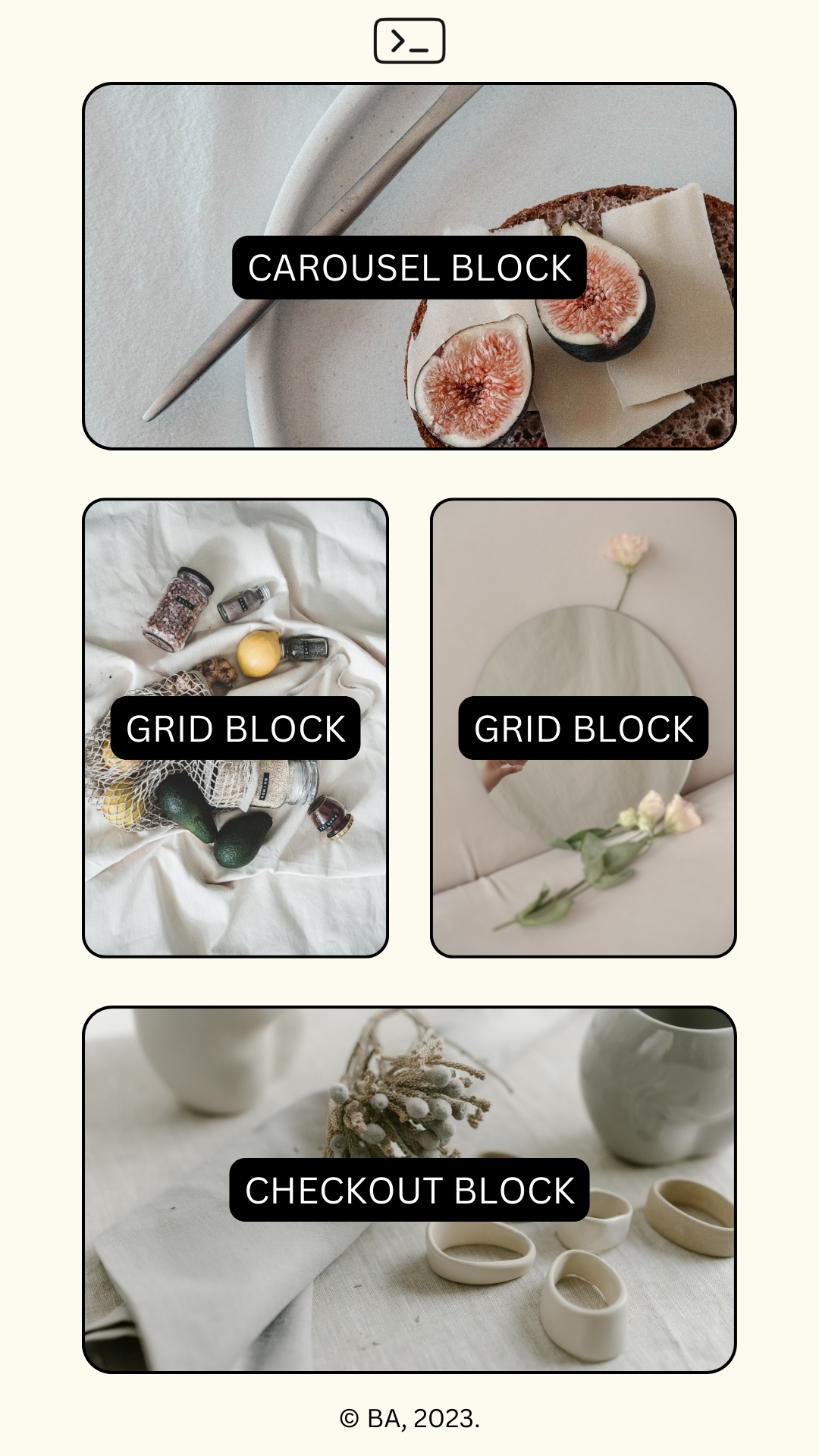 The UI will now read and render the data (the UI Schema) without further processing or delegation. The supplied JSON data already stipulates how and where to present each product data to the UI using the componentType property. The backend now includes UI components for the screen alongside the product information (UI components' layout view, appearance shape, content, etc.), and the client already has the agnostic templating logic to add styling to the displayed visuals. In the above MVP example, product A will be rendered first in the Grid Block, followed by product B in the Carousel Block, as shown in the image below.